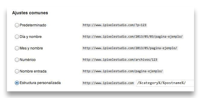 Puedes configurar las URLs de tu sitio web en WordPress como amigables a los buscadores seleccionando la opción “Estructura personalizada” en Ajustes >> Enlaces permanentes e introduciendo el siguiente parámetro en el campo de texto.
