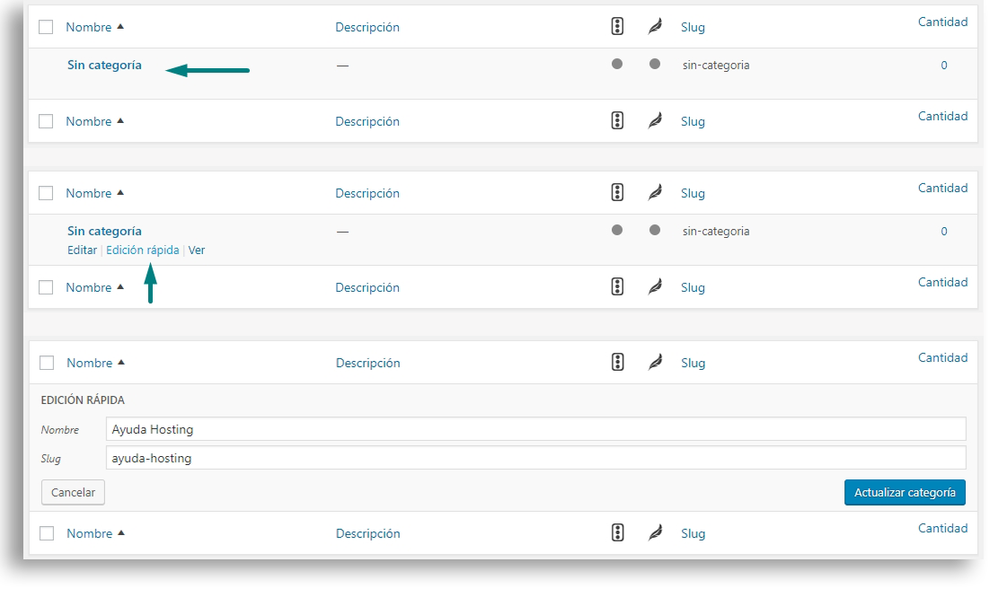 Si sitúas el cursor sobre dicha categoría aparecerá un submenú con la opción “Edición rápida”, haz clic en ella y podrás acceder a las opciones de edición rápida.