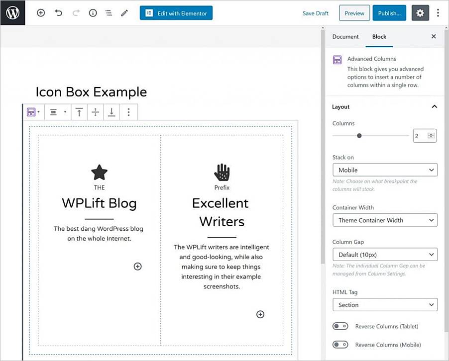 Estos bloques facilitan agregar un cuadro de icono en nuestro contenido. Si los combinamos con el bloque Columnas, podemos crear fácilmente nuestra propia sección de características.