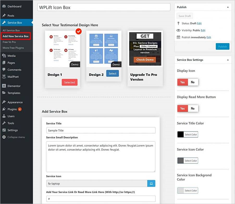 Una vez que instalamos y activamos el plugin, podemos ir a Service Box -> Add New Service Box en nuestro tablero del administrador de WordPress.