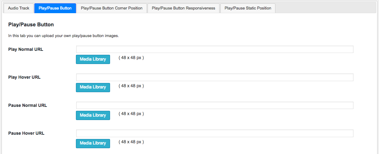 Por medio de la opción Play/Pause Button tendremos la funcionalidad subir imágenes que figurarán en nuestro botón de Play. Por otra parte, este plugin nos ofrece la oportunidad de modificar otras opciones con respecto al diseño como por ejemplo, el tamaño de los botones.