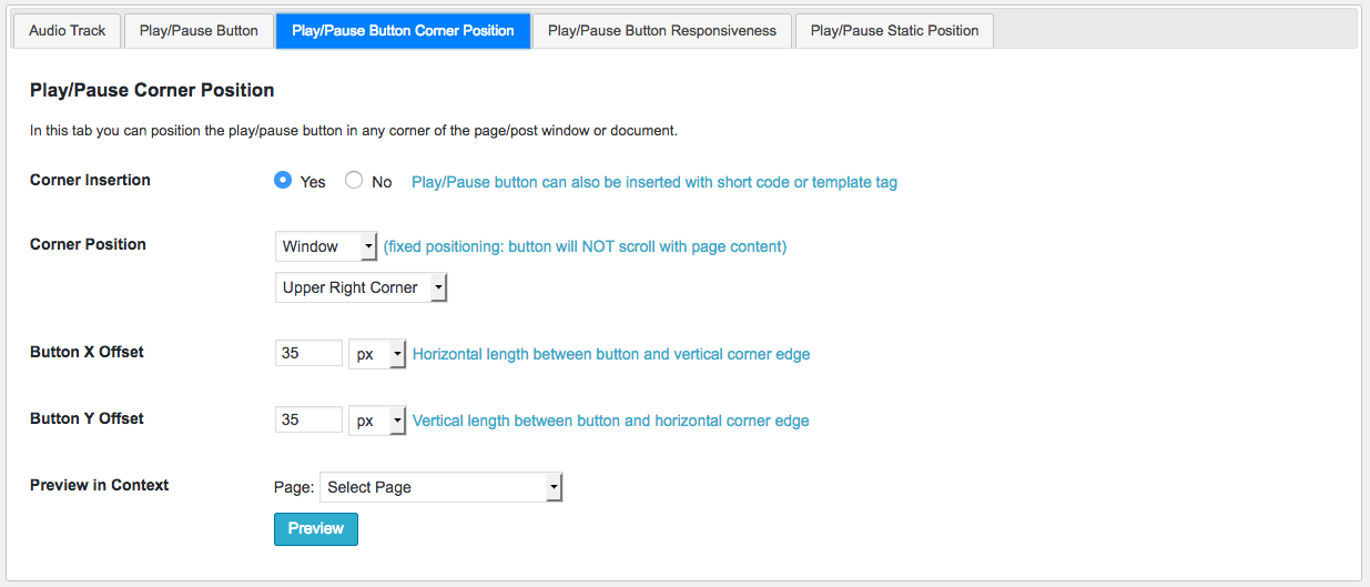 En la opción Play/Pause Button Corner podremos definir dónde queremos que se muestre nuestro reproductor de música. Para llevar a cabo esto tendremos en cuenta varios parámetros.