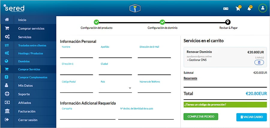 El siguiente paso es Ver carrito. Continúa con las formas de pago y ya tendrás tu dominio renovado por el tiempo escogido.
