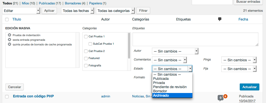 Con esto, los posts que hemos seleccionado quedarán archivados y no estarán a la vista en la parte pública de nuestra web de WordPress.
