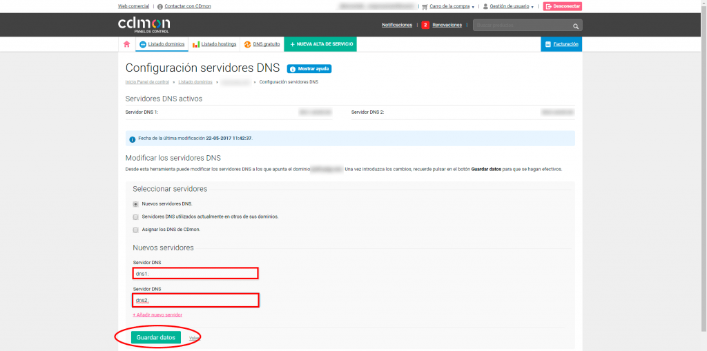 Cuando estemos en la gestión de servidores, rellenamos con el nombre de servidor DNS que queremos redireccionar y los escribimos en los campos de texto. Finalmente le damos a guardar cambios y ya estaría listo el proceso.