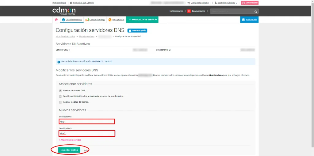 Cuando estemos en la gestión de servidores, rellenamos con el nombre de servidor DNS que queremos redireccionar y los escribimos en los campos de texto. Finalmente le damos a guardar cambios y ya estaría listo el proceso.