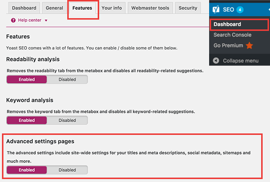Primero necesitas instalar y activar el plugin Yoast SEO. Tras la activación, es necesario visitar la página SEO -> Dashboard y hacer clic en la pestaña Características. A continuación, desplázate hasta la sección Páginas de configuración avanzada y asegúrate de que esta opción esté Habilitada.