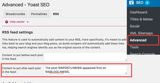 Método 1. Agregar contenido al pie de página de RSS utilizando Yoast SEO