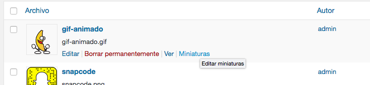 Este plugin también puede funcionar para que editemos las miniaturas antiguas. Sólo debemos dirigirnos a Multimedia -> Biblioteca y colocar el mouse en la imagen que reza editar. Luego observaremos un enlace que se denomina miniaturas.