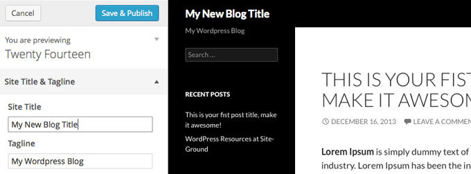 La página de personalización de temas te permite modificar el título y el eslogan o tagline sobre tu web, además de distinguir cómo se visualizará tu web simultáneamente mientras lo modificas. Para ello, expande las opciones de ajuste del Título (Title) y Eslogan (Tagline) de la web. En la medida en que vas escribiendo en el cuadro de texto, verás aparecer el nuevo texto en la vista previa que aparece a la derecha. Una vez que estés satisfecho con el resultado, haz clic en el botón Guardar y Publicar.