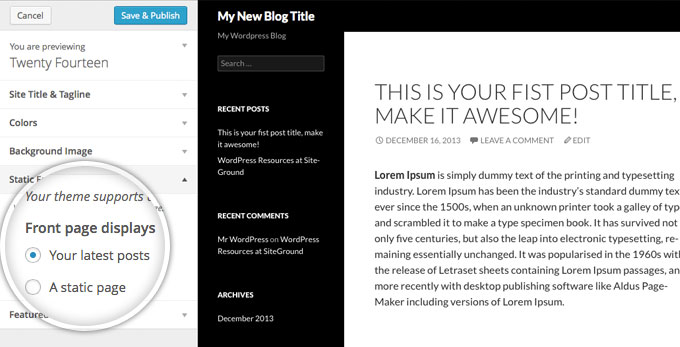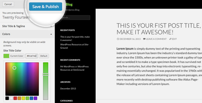 Puede haber otras opciones en esa página dependiendo del tema que estés utilizando. El tema de Twenty Fourteen, por ejemplo, te permite modificar los colores del título y del fondo. Además, añadir una imagen de fondo y otras características más. Una vez que estés satisfecho con el resultado, haz clic en el botón Guardar y Publicar para guardar los cambios.