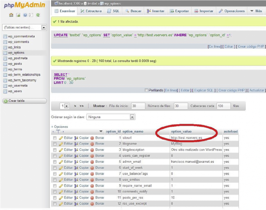 En el caso de que hayamos cambiado de dominio, debemos ingresar a la base de datos en phpMyAdmin. Por ejemplo, si se quiere modificar la URL, en la tabla wp_options debemos hacer cambios en option_name en el valor siteurl. Debes modificar la opción option_value por el nuevo dominio. A continuación, se puede observar en la captura de pantalla:
