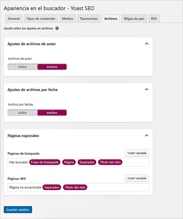 Si cuentas con un sitio de un solo autor, será exactamente igual a tu página principal. Esto normalmente se conoce como problema de contenido duplicado. En el caso de que esto pase en tu sitio puedes desactivarlo si así lo deseas o añadirle un noindex, follow para que estos no aparezcan en los resultados de búsqueda. Los enlaces puede que se muestren en tu tema y es posible que debas eliminarlos por tu cuenta. Los archivos que estén basados en fechas podrán considerarse en ciertos casos como contenido duplicado.