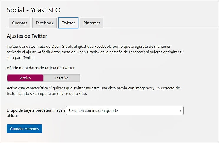 Twitter cuenta con datos meta de Open Graph, así como lo hace Facebook, por esa razón debes estar seguro de mantener activado el ajuste Añadir datos meta de Open Graph directamente en la pestaña de Facebook si deseas optimizar tu web para Twitter.