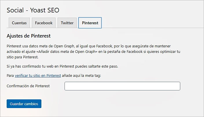 Al igual que Twitter, Pinterest también usa datos de Open Graph, por eso debemos estar seguros de mantener activo el ajuste Añadir datos meta de Open Graph en la pestaña de Facebook si queremos tener optimizado nuestro sitio para Pinterest.