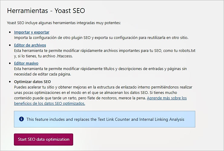 La función de optimización ayuda a acelerar nuestro sitio y mejorar la estructura de enlazado interno, ayudándonos a emplear algunas optimizaciones para que se almacenen los datos SEO. Si tienes un sitio con mucho contenido, puede que tarde un tiempo, pero es una acción recomendada que te brindará grandes beneficios.