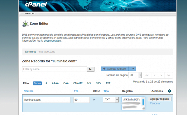 Procedemos a añadir el registro TXT en el editor de Zona de cPanel.