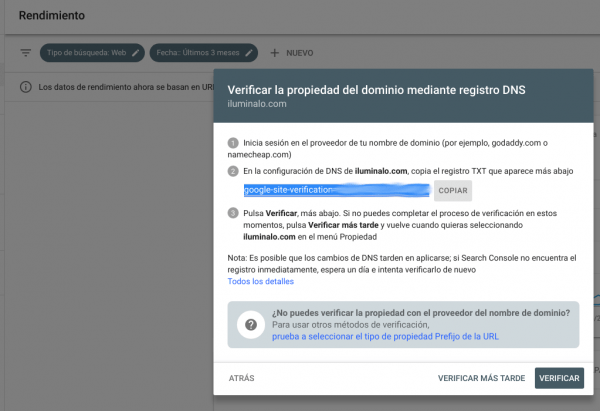 Cuando intentas verificar la propiedad de tu dominio, Google te indicará un código que debes colocar en el registro TXT.