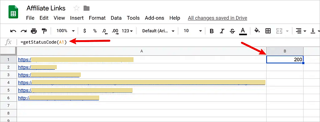 En hojas de cálculo de Google, editamos la columna junto a nuestra lista de URL e ingresamos =getStatusCode(A1).