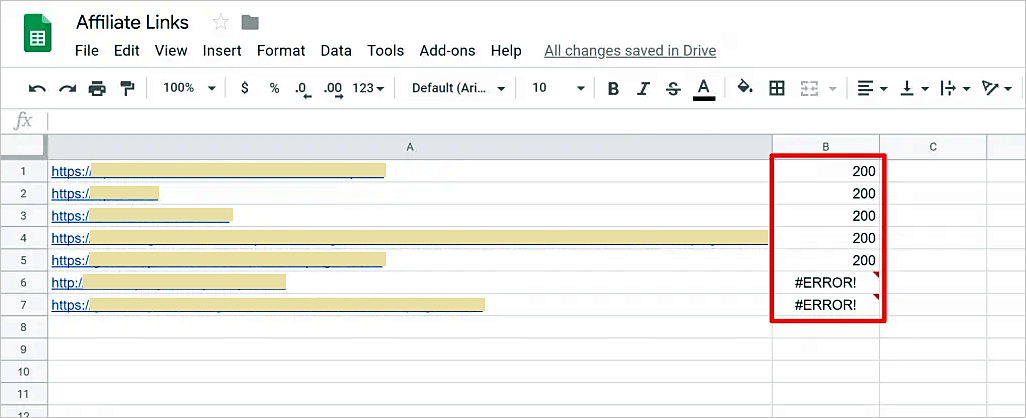 Luego, lo arrastramos hacia abajo para cubrir todas nuestras URLs. Una vez que hagamos eso, deberíamos ver el código de estado HTTP de cada enlace en la columna al lado del enlace. Si vemos 200, eso significa que la URL funciona normalmente. Si vemos #ERROR!, eso significa que hay un problema con el enlace y probablemente esté roto.
