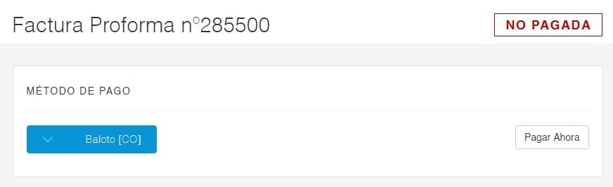 Accede a tu factura y elige el método de pago, que en este caso es Baloto. A continuación hacemos clic en «Pagar Ahora».