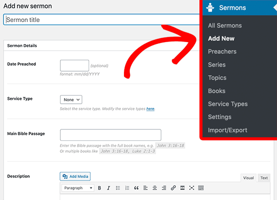 Primero tendrás que agregar el plugin Sermon Manager para WordPress. Si quieres conocer más detalles al respecto, puedes visitar nuestra guía de cómo instalar un plugin de WordPress.