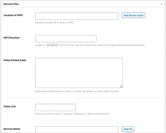 El segundo conjunto que estarás consiguiendo te permitirá colocar una URL para tus archivos, ya sea que estés colocando un audio, vídeo o ambos. También estarás consiguiendo un lugar donde podrás insertar notas del sermón y si deseas apuntar también un archivo PDF.