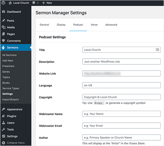 Para comenzar con esto, debes dirigirte a la sección de Sermones y hacer clic en Configuración, luego selecciona Podcast. Esta sección se ha creado por los desarrolladores del plugin y se explica por sí sola, por lo que sólo deberás completar los espacios con tus datos que corresponden a tu iglesia.