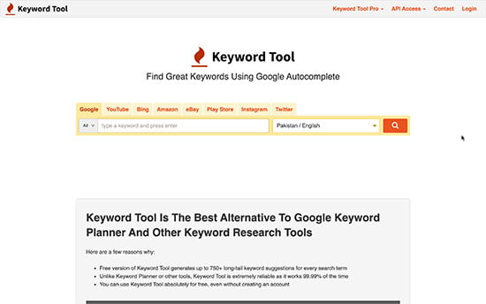 Keyword Tool es una excelente herramienta para la investigación de palabras clave que se encuentran disponibles en ese momento. Ofrece la posibilidad de generar ideas de palabras clave solamente con escribirlas. La sugerencia de palabras claves se va recopilando por medio de la función de sugerencia automática de Google. Al igual, se muestran sugerencias de palabras clave para YouTube, Bing, Amazon y otras plataformas.