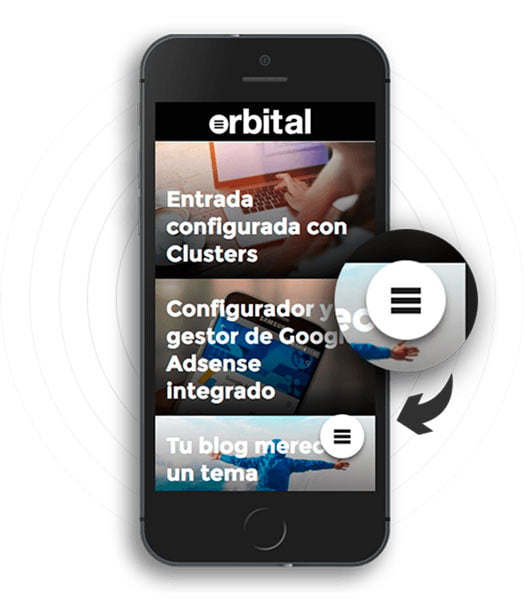Orbital Theme es la única plantilla responsive que cuenta con el Menú Orbital®, una evolución de los menús tradicionales, que son un residuo ineficiente de las versiones desktop.