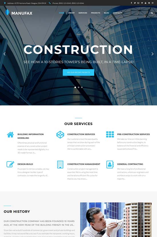 Otra plantilla que se une a esta lista es Manufax, siendo una gran herramienta a la hora de construir un sitio web. Es bastante potente, con un diseño llamativo y creativo que le dará un toque diferencial a tu sitio web. Puedes personalizarlo según la idea que tengas en mente y tus propósitos gracias a Elementor y el plugin Jet que vienen incluidos en el tema.