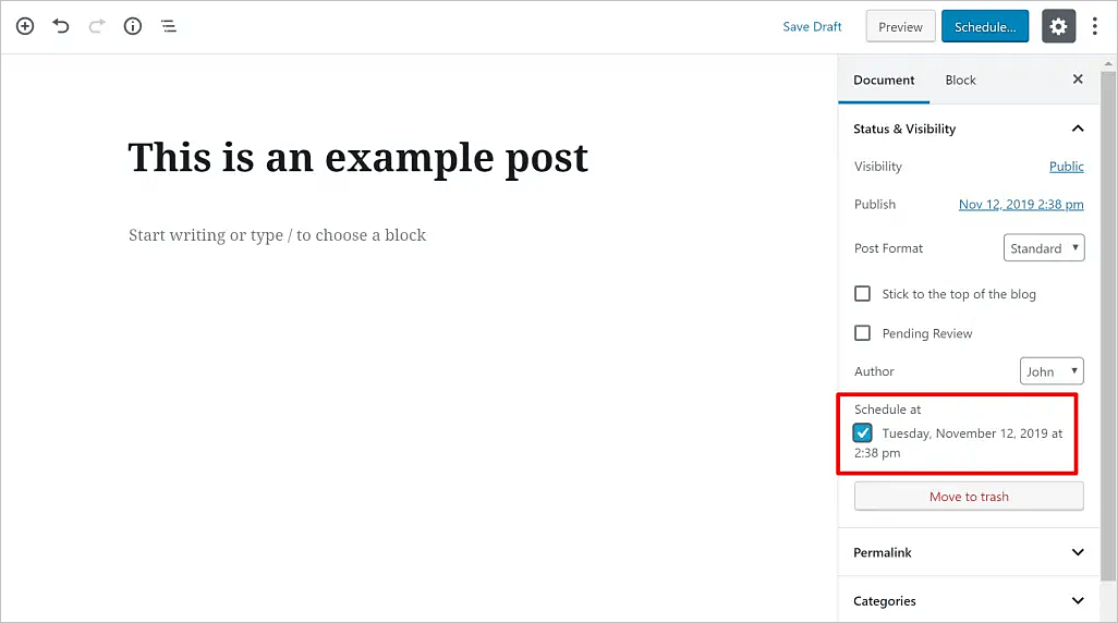 Además de la vista de calendario, las publicaciones programadas también sugerirán automáticamente una fecha en el editor de WordPress, que podemos habilitar con solo marcar una casilla.